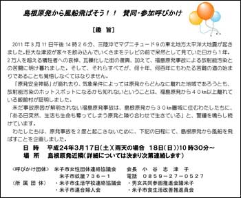 | 詳細 | ----------------------------------------------------------- 島根原発から風船飛ばそう!! ![]() ◆日時:平成24年3月17日(土)10 時30分~ ※雨天の場合18日(日) ◆場所:島根原発近隣 ※詳細については決まり次第連絡します) ◆趣旨: 2011年3月11日午後14時26分、三陸沖でマグニチュード9の東北地方太平洋大地震が起きました。 巨大な津波が家々を飲み込んでいくさまをテレビの前で呆然として見ていた日から1年。2万人を超える犠牲者への哀悼、瓦礫化した街の復興、加えて、福島原発事故による放射能汚染との苦闘に明け暮れました。そして、それらすべてが、何十年、何百年にもわたる苦難の道の始まりであることも覚悟しなくてはなりません。 「原発安全神話」が崩れ去り、気象条件によっては原発からどんなに離れた地域であろうとも、放射能汚染のホットスポットになるかも知れないということは、福島原発から40㎞以上離れている飯館村が証明しました。 未だ事故原因が解明されない福島原発事故は、島根原発から30㎞圏域に住むわたしたちに、「ある日突然、生活も生命も奪ってしまう原発と隣り合わせで生きている」と、警鐘を鳴らし続けています。 わたしたちは、原発事故を2度と起こさないために、上記の日程にて、島根原発から風船を飛ばすことを企画しました。 ◆呼びかけ団体:米子市女性団体連絡協議会(会長:小谷志津子) 米子市蚊屋736-1 電話0859-27-0527 所属団体:米子市生活学校連絡協議会/男女共同参画推進会議米子 米子市連合婦人会/米子市食生活改善推進員会 |